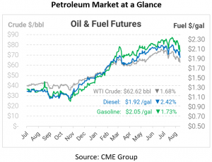 - Enthusiasm Wains – When crude oil prices roared past $70, it wasn’t because oil markets were tight at the time. Inventories were generally above pre-pandemic levels, and global demand has a long way to go before surpassing normal levels. Traders bid up prices because they anticipated better times ahead. Vaccine rollouts and climbing demand instilled confidence that the world would recover and oil markets would be righted again. The delta variant hasn’t caused a huge demand slump or skyrocketing inventories (so far), but it has sapped confidence in the bounce back. With traders no longer pricing in a huge recovery, prices are falling back to levels more reasonable given today’s fundamentals.