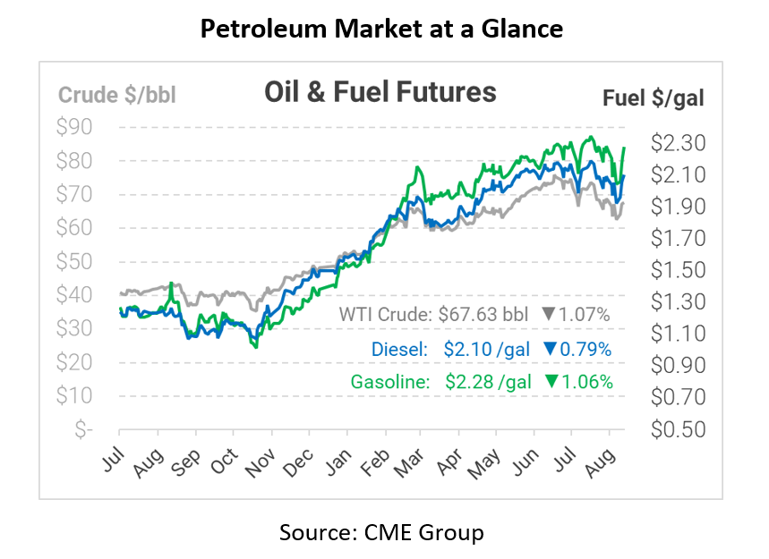 The Energy Information Administration (EIA) said that crude inventories fell this week for a third straight week while overall fuel demand peaked highest since March 2020. Last week crude oil inventories fell by 3 million bbl and are currently 6% below the seasonal average. The optimism within the numbers lies in the fact that gasoline demand has increased, as shown last week, from 239,000 b/d to 9.57 million b/d. Labor Day weekend is just around the corner, and gas sales are expected to skyrocket for the entirety of next weekend. However, last week OPIS reported that same-station gasoline transactions were down by 1.5%, showing that this increase in retail prices is causing some demand destruction. With higher prices at gas stations comes the hesitancy of consumers to purchase fuel; however, vacation time coming next weekend, it seems as though many people will be purchasing fuel regardless.