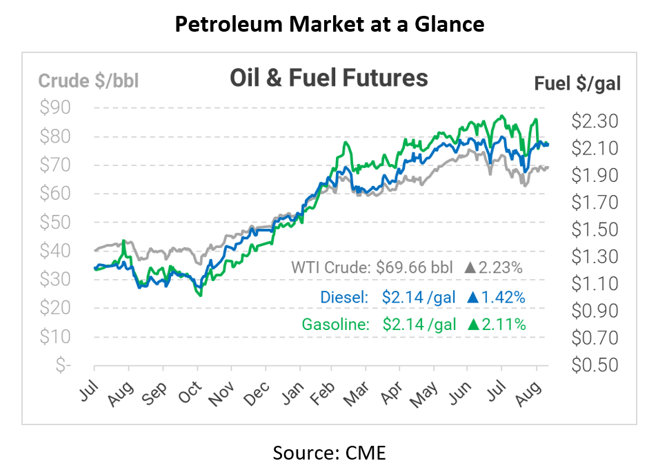 Oil markets continue bouncing up and down, with today marking a bounce higher. Crude oil is up by roughly $1.50, and fuel prices are 3-4 cents higher – but overall, prices haven’t moved much in the past two weeks. Diesel prices have been between $2.11-$2.16 since Aug 30. Crude oil has been in an even smaller band between $68.50 and $69.99 (dividing by 42 to go from barrels to gallons, that’s a 3.5 cent per gallon range). Despite several up and down days lately, fuel markets have been stable. The exception is gasoline, which sank 15 cents on Sept 1 when future markets rolled to the October contract.