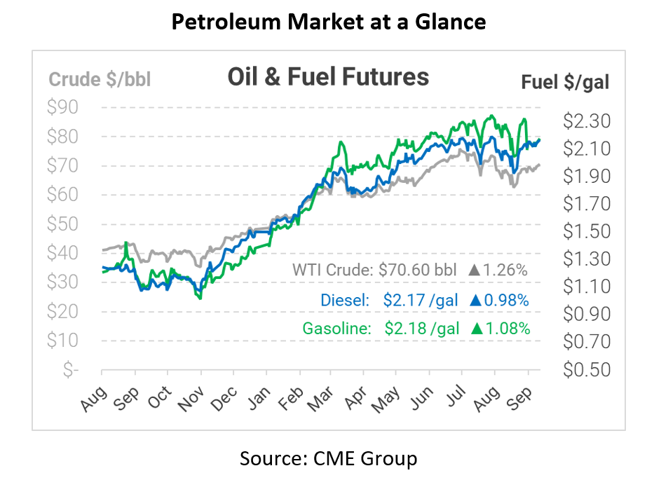 This morning crude opened at $70.55, up from Friday’s closing price. Diesel and gasoline followed the same upward trend this morning, with diesel opening at $2.1436 and gasoline at $2.1570. Today’s rise in prices comes after a continued fear of halted output due to Hurricane Ida clouds the market, with many suggesting it will take much longer than originally anticipated to get refineries completely back online.