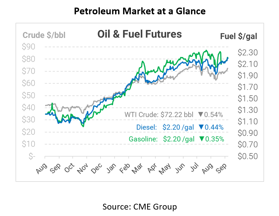 This morning prices fell slightly as the threat to Gulf oil production started to dial back with the recent downgrade of Category 1 Hurricane Nicholas into a tropical depression. Today crude oil opened at $72.65, while diesel opened at $2.2065, and gasoline at $2.2084.