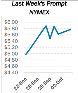NYMEX Henry Hub prompt-month futures surged briefly to over $6 in Oct. 4 trading as US gas production stumbles below 90 Bcf/d with storage inventories still trailing typical pre-winter levels. The November contract ended trading at $5.77/MMBtu, up about 15 cents on the day, and just 10 cents shy of a recent seven-year high settlement for the prompt-month contract. Gains on the December, January and February contracts were of only slightly smaller magnitude with the peak-winter months all settling in the $5.80 to $5.90 range, data from S&P Global Platts showed. The precipitous surge in NYMEX futures accompanied gains in the cash market where prices were up about 30 cents Oct. 4 to trade in the upper $5.80s/MMBtu, preliminary settlement data showed. Over the near term, weather forecasts calling for unusually mild…
