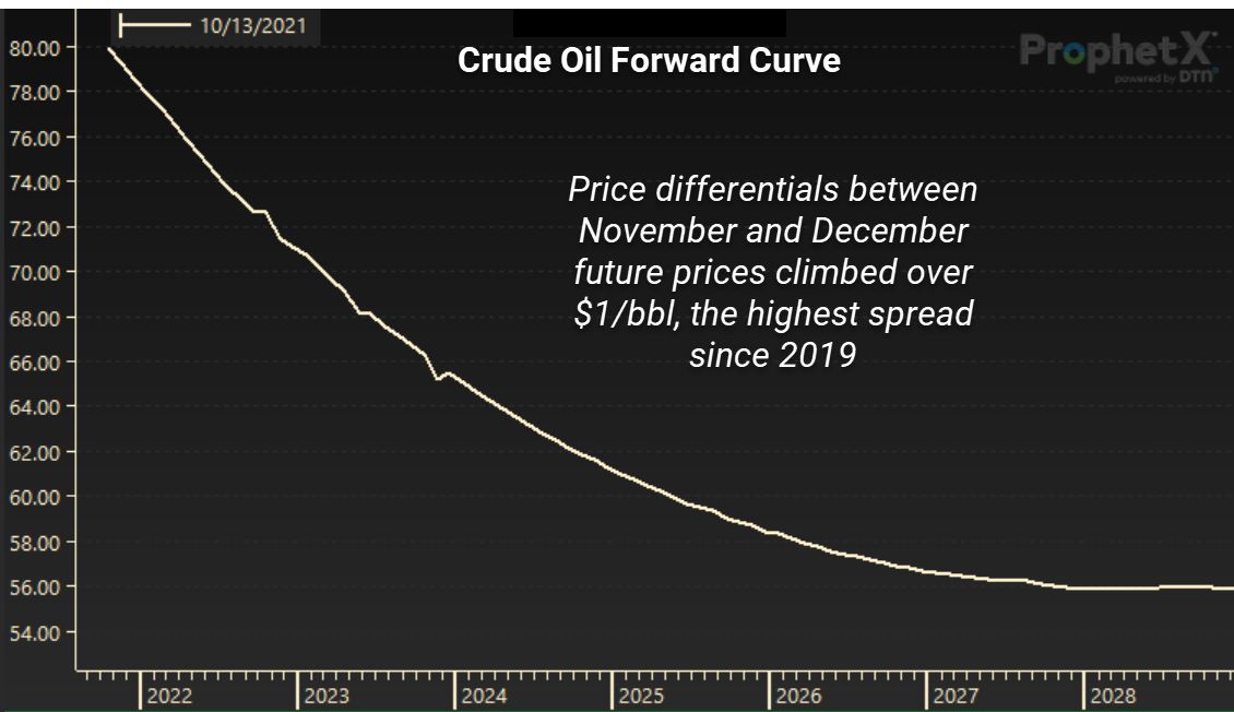 In the US, crude prices have become steeply backwardated, meaning that current prices are dollars higher than 2022 future prices i. The pricing structure suggests that markets are tight currently, so don’t expect any quick relief at the pump. Price differentials between November and December future prices climbed over $1/bbl, the highest spread since 2019.