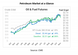The midweek selloff stemmed from an inventory update on Wednesday, in which the EIA reported that crude stocks rose by over 4 million barrels the week prior. On the fuel side, though, inventories continue falling as refineries go through planned maintenance in different parts of the country. Refinery utilization is around 85% right now, meaning refiners are only using 85% of their total capacity. That’s down from over 90% earlier this summer. Utilization is right around seasonal averages, but demand remains strong – and the upcoming holiday season should see plenty of travel. Climbing crude inventories should help keep prices from rising too much, but tight fuel markets will still cause some pain at the pump this year.