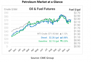 Oil prices are rising once more this morning, regaining some steam thanks to the EIA’s inventory report. Of course, Omicron concerns are weighing on markets, but the planned distribution of 500 million test kits is providing support. While the test kits on their own won’t impact demand, it does seem to be the Biden administration’s way of avoiding lockdowns. Reports from South Africa now show that Omicron results in 80% fewer hospitalizations. Adding to favorable news, the UK announced it will not be imposing any further lockdowns during the busy holiday season.