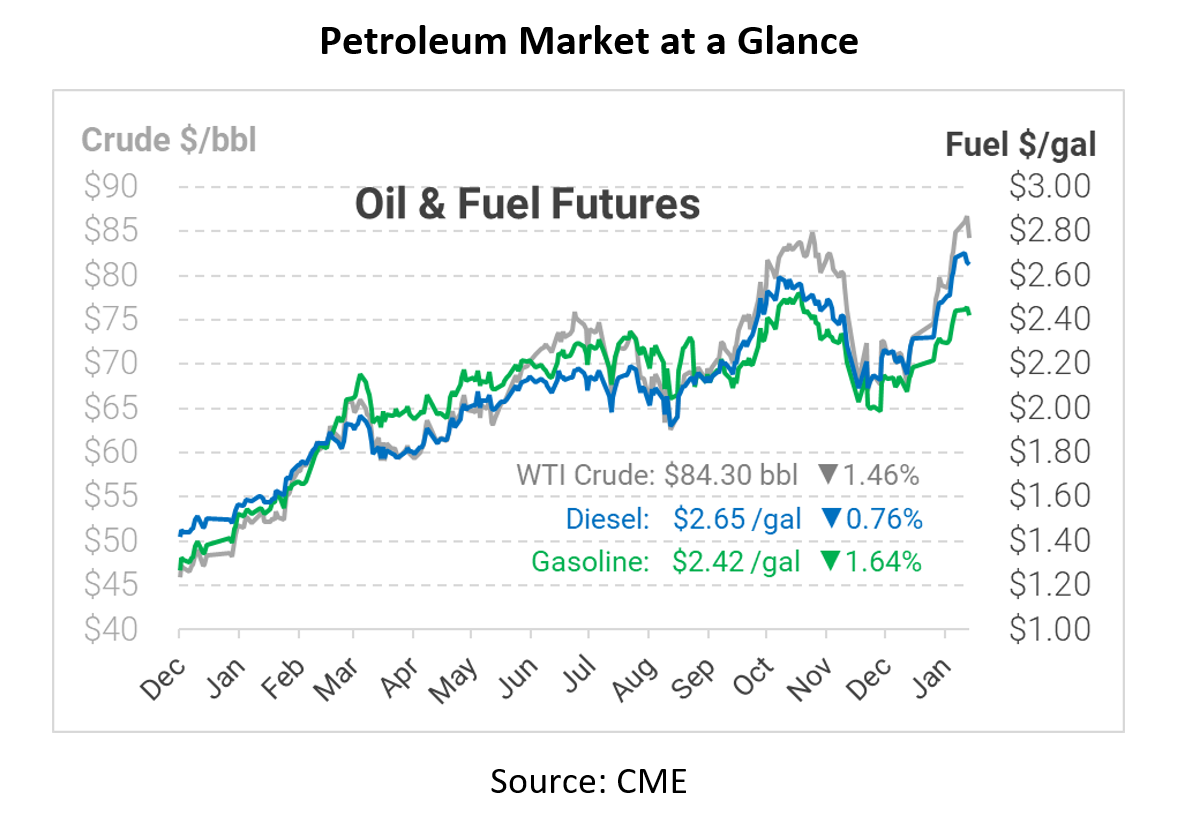 Part of the slow trading may be due to the approaching winter storm for the East Coast, the second storm in a week. With 60 million residents under ice and snow advisories, travel will slow down, curbing gasoline and jet fuel demand. Of course, there are some factors that make for it, including panic buying before/after the storm and the deployment of recovery teams like utility trucks and snow plows. Cold weather will also bring an uptick in heating oil demand, putting upward pressure on diesel prices.