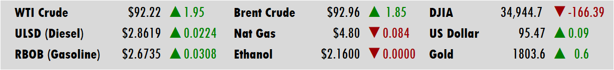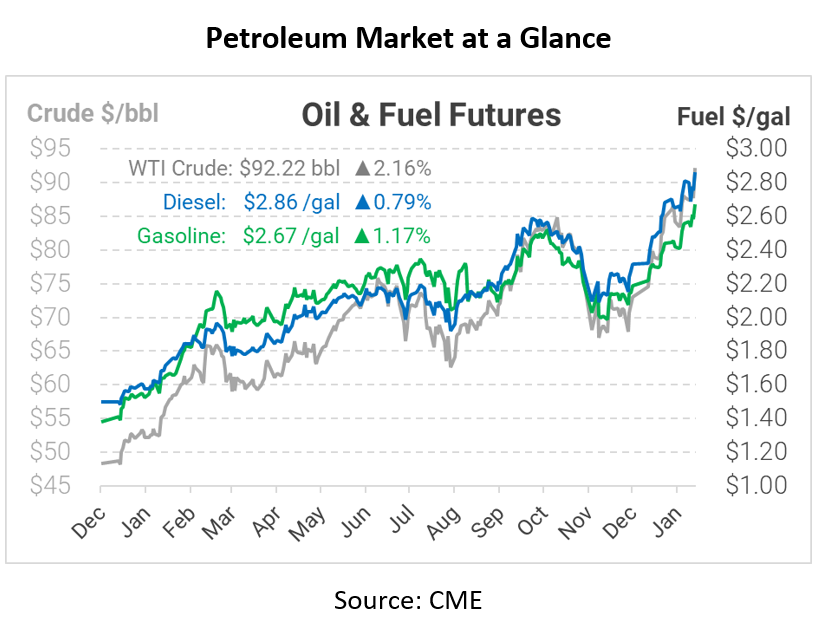 Crude oil prices have already gained over 20% this year, adding to last year’s hefty upward march. In addition to rising post-COVID demand and supply tightness in the US, Middle East tension and the Russia-Ukraine situation are propelling prices higher. Moreover, a sinking US dollar – which is inversely correlated with commodity prices – is providing tailwinds for the oil rally. Many have pointed to OPEC’s decision to continue with slow production increases as the catalyst for this week’s rally, but in reality many factors are contributing. It’s been seven years since prices were this high, so it’s possible we could see some big swings up and down in the coming weeks as traders get their footing.