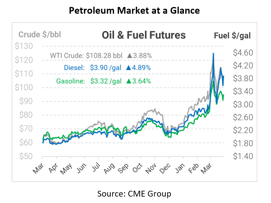 Prices are up this morning following the continued bombing of Ukrainian cities, despite Russia’s pledge this week to pull back from the city of Kyiv and increase mutual trust between itself and Ukraine. Russia continues facing economic hardship due to strict sanctions imposed by NATO countries. Now, in an attempt to make business painful for the West, Vladimir Putin has warned that all oil and gas exports going forward could be priced in rubles.