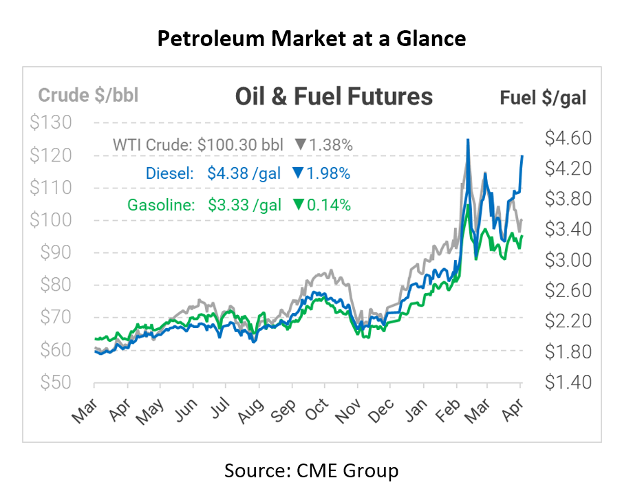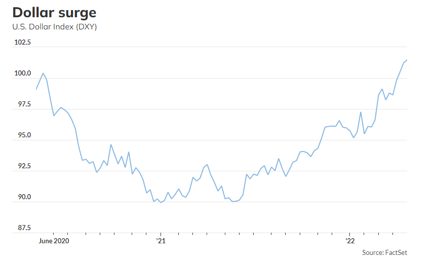 Today oil is down slightly as a rising US Dollar presents headwinds for commodity prices. This week the dollar hit a two-year high as commodities continue to take a dip. A rising dollar makes oil more expensive for other countries who must trade their weaker currencies for USD before buying the oil; this rising cost globally reduces demand and, in turn, the price of oil in dollars. The rising strength of the dollar adds pain for other countries who must convert currencies beforFe purchasing oil, at a time when oil prices are already at historic highs. Today WTI crude opened the morning at $101.76, diesel at $4.4500, and gasoline at $3.3720.