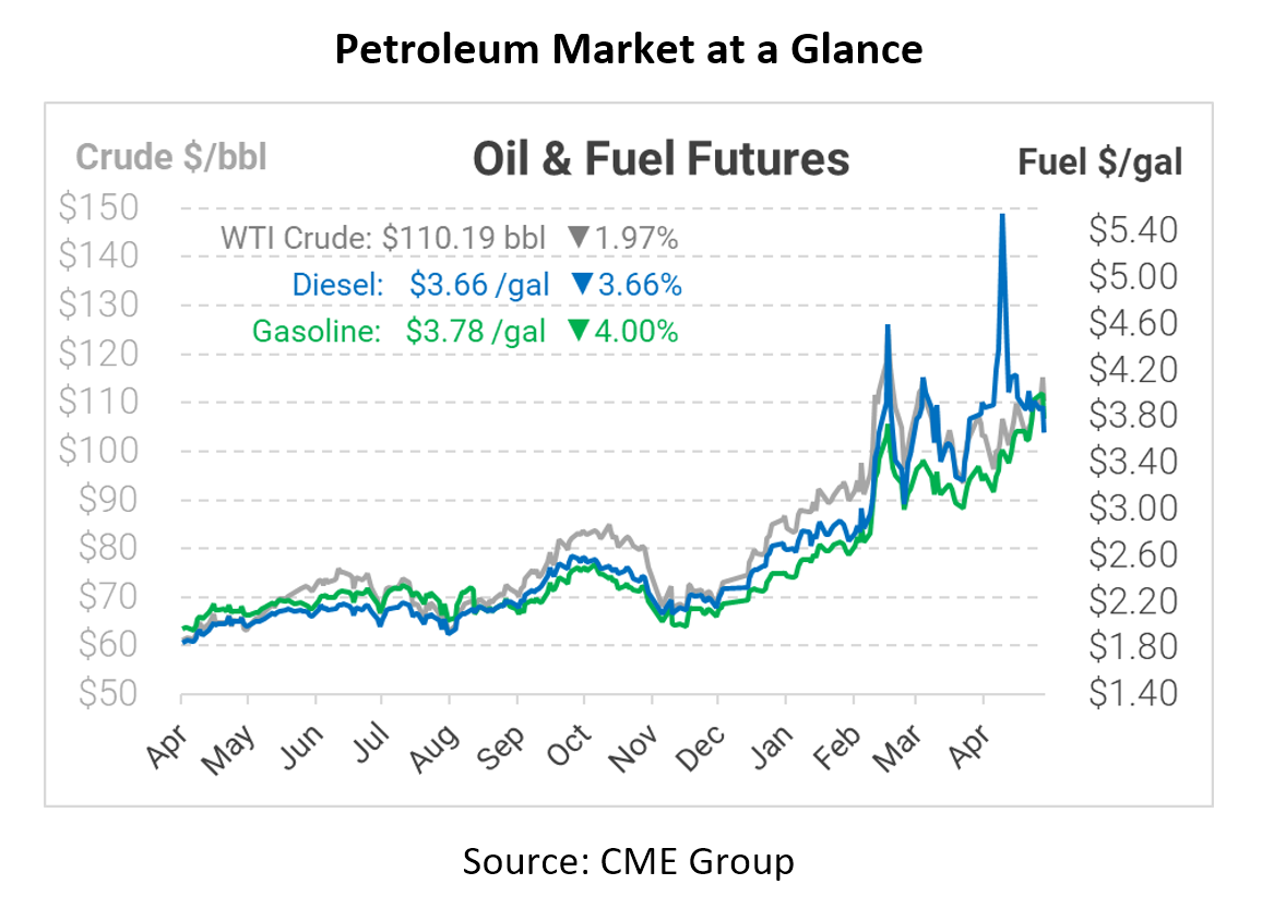 This morning the EIA reported a meager 1.2-MMbbl build for diesel inventories – a small victory given historically low diesel inventories. Oil markets appear to be celebrating the news this morning, with fuel prices down roughly 15 cents following the morning report. Both gasoline and diesel have moved away from the $4/gal threshold, though a quick spike to $4 remains quite possible given recent volatility.