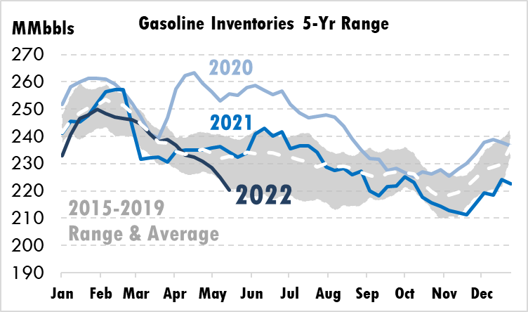 Peak summer gasoline demand typically begins with Memorial Day and lasts through Labor Day. This week, gasoline demand rose above 9 million barrels per day for the first time since March. Although the level is a bit behind pre-COVID levels, it’s in line with 2021 averages. Last year, summer demand averaged 9.4 MMbpd – meaning refiners will have to figure out how to add another 400 kbpd (16.8 million gallons) of output or pull that from inventories. Assuming all of that comes from inventories, stocks could fall by 36 million barrels to 184 million barrels – the lowest level since October 2008.
