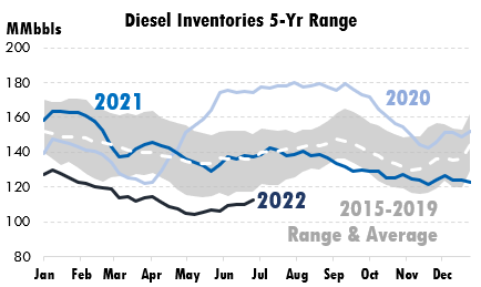 Second, inventories are (finally) improving. Diesel has been a big concern for the market, since Europe relies heavily on diesel fuel for both consumer and industrial demand and can no longer purchase Russian oil. In the US, diesel inventories remain sharply below the pre-COVID range, but they have climbed 8 million barrels higher since bottoming out in May. Markets are responding favorably to rising gasoline and diesel inventories.