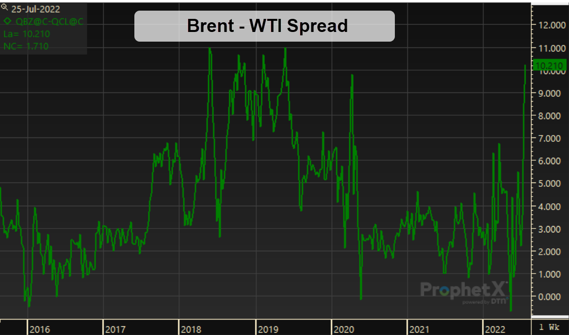 Europe’s energy crisis is also weighing on American markets. The spread between Europe’s Brent crude index and the US’s WTI crude index has reached its widest point in years. Previous highs in 2019 were caused by pipeline issues that trapped WTI crude oil domestically, causing a brief oversupply. Generally, the two crude indexes trade within a few dollars of each other, but the spread is now over $10/bbl. That increase opens up and arbitrage for traders, who can ship oil to Europe for a few dollars per barrel and profit off the rest. Analysts expect the gap to close as more US shipments are sent abroad; exports are already at record highs, with further gains expected. Put another way – US consumers will have to pay more to close the gap and keep US oil at home.