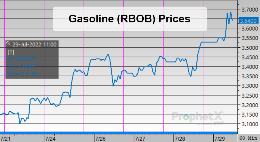 Like diesel, gasoline saw some big gains this week. Gasoline began the week at $3.2318, picking up 15 cents before the end of Monday’s trading session. After retreating on Tuesday, prices climbed steadily for the remainder of the week. Gasoline opened at $3.5489 on Friday, up 31.7 cents (+9.8%).