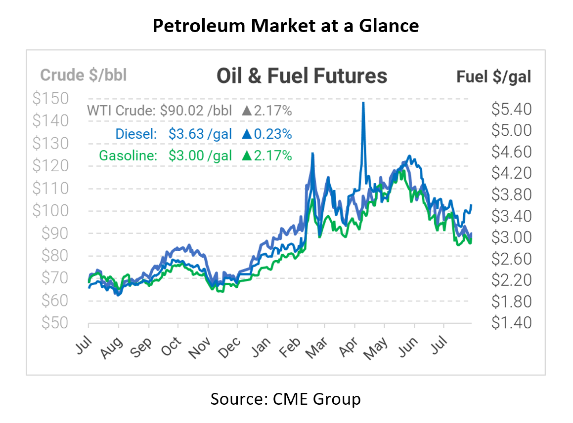 While demand is strong, refinery output may take a hit in the coming weeks. Utilization fell from 94.3% to 93.5%, and OPIS reports that we could see a higher than usual refinery turnaround time this fall. Many refineries delayed downtime earlier this year when crack spreads rose to record highs; now, they’ll need to catch up to ensure equipment is operating safely. Pair that with hurricane season and tight inventories, and we could certainly see some tight markets this fall!