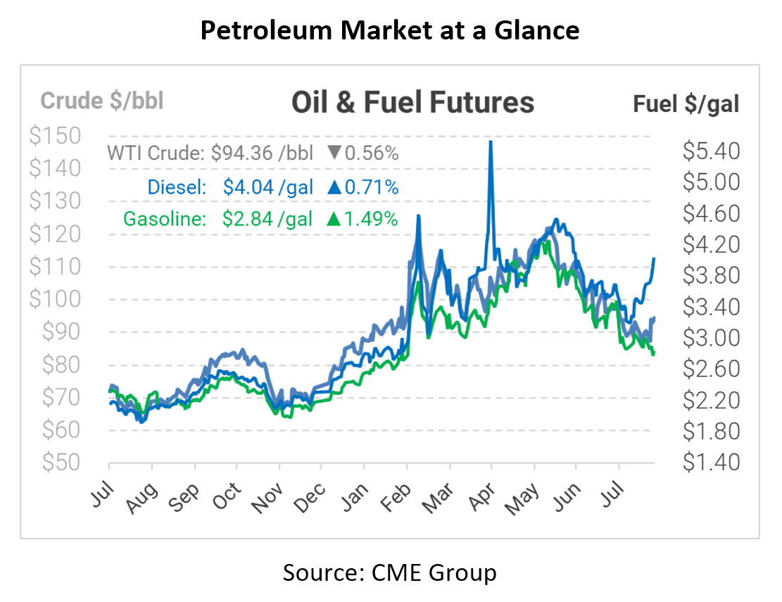 On the domestic supply side, inventories showed an across-the-board withdrawal this past week, spooking the markets and sending prices higher during morning trading. Crude oil was down 3.3 million barrels. Diesel stocks, which typically rise during the summer, fell 0.7 million barrels. While the size of the draw isn’t significant, anything other than a build is strongly bullish ahead of hurricane season and refinery turnarounds in September and October.