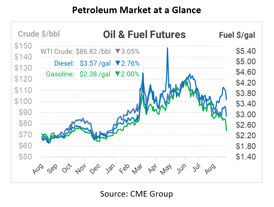Diesel volatility continues, with diesel prices down nearly 50 cents from their starting price on Monday. In the past month, diesel prices fell from $3.80 to $3.20, then soared to $4/gal, and now sit closer to $3.50. Dramatic swings are stemming from demand concerns in China, where fresh COVID lockdowns in Chengdu, a city with 21 million people, have slashed manufacturing activity and fuel demand. In addition to falling demand, supplies are beginning to take a more bearish slant also.
