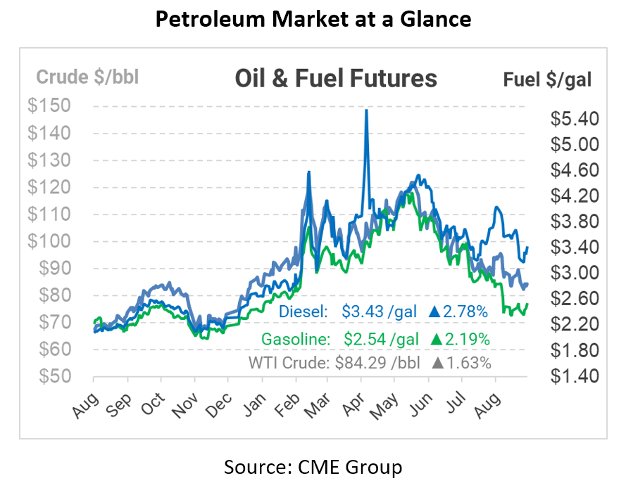 Rather than worrying about economic news, though, markets are responding to more bullish market indicators this morning. China’s oil demand is rebounding thanks to increased export quotas. The changes should cause crude oil prices to go up while lowering diesel prices, though today the market seems to be reacting more to the former phenomenon. Moreover, Russia has announced their largest conscription since World War II, a sign that the conflict is escalating and could prolong oil embargoes set to go into effect in January.