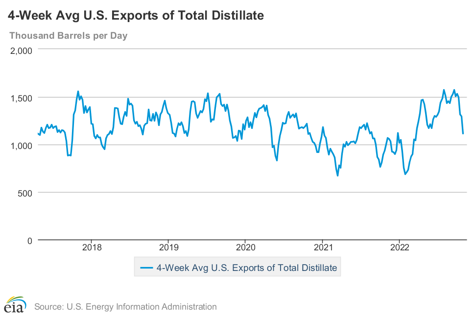 The third part of the equation is diesel exports abroad. Diesel exports aren’t as seasonal as production and inventory levels – they tend to move from week to week based on global economics, price arbitrage opportunities, and supply imbalances here and abroad. This year, in July and September, the US set the two highest-ever 4-week average diesel export levels, around 65-66 million gallons per day. Since October, exports have declined sharply to roughly 45 million gallons per day, but those weeks of high exports correspond to diesel inventories sinking farther below the average.