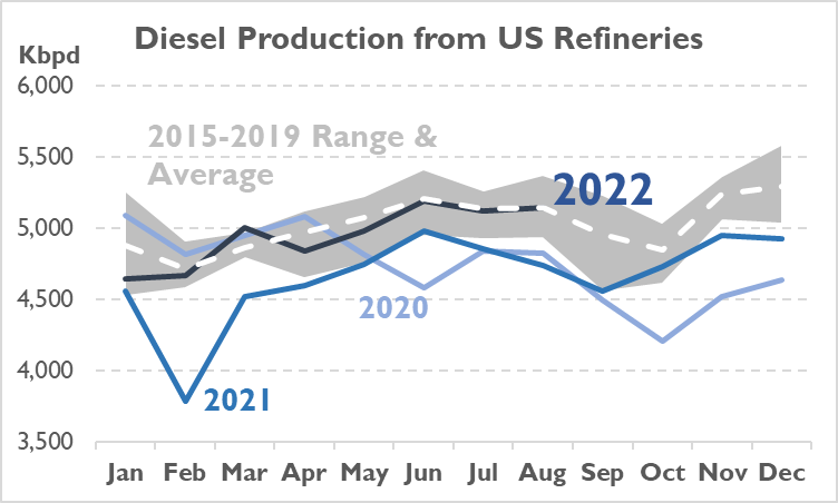 The biggest reason why we’re seeing low inventories this year is, quite simply, because we’ve had low inventories for over a year. For the first half of 2021, diesel inventories were right near the five-year average; in the second half of the year, inventories began slowly falling. Diesel inventories typically follow predictable seasonal patterns, falling during the winter, rising over the summer, then a quick build and fall in the fall ahead of refinery maintenance season.