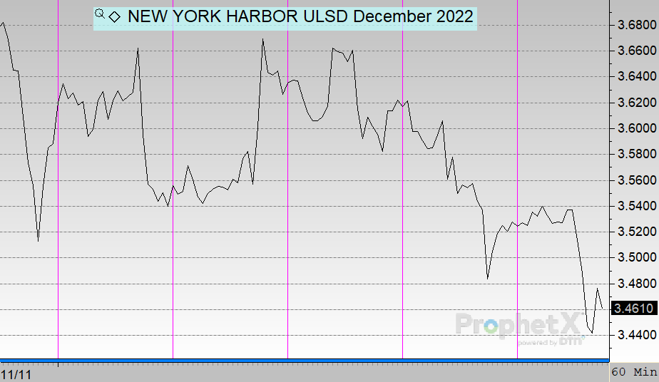 Diesel prices were a bit more volatile this week, jumping up and down early in the week before turning lower after the EIA’s report. Diesel opened the week at $3.5846, but rose above $3.60 early on. That wouldn’t last, though, and prices tumbled Thursday down towards $3.50. On Friday, diesel opened at $3.5199, down 6.5 cents (-1.8%). Currently, the market is trading even lower, with prices around $3.45.