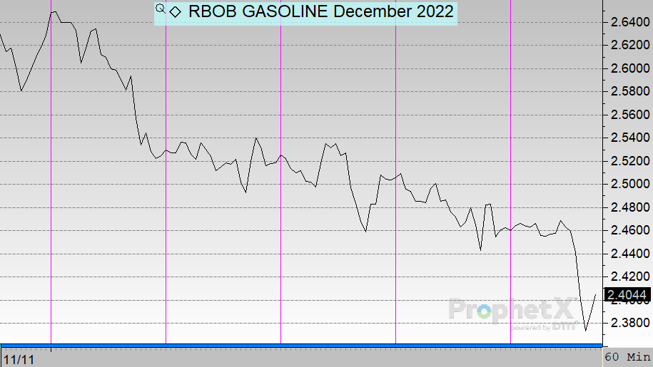 Gasoline saw persistent losses through the week, with a sharp drop on Monday and continued losses after that. Opening at $2.6193, prices fell each day this week. On Friday, gasoline opened at $2.4660, down 15.3 cents (-5.9%).