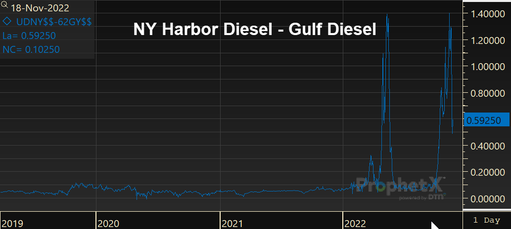 Diesel price volatility is beginning to calm some, with the spread between NY Harbor and Gulf Coast diesel prices now “only” 60 cents. Although down from $1.40 a few weeks ago, that’s still 6x more than the typical upper limit before 2022. While the spread remains open, diesel producers are incentivized to move product directly from Gulf Coast refiners to New York Harbor, circumventing the Southeast and causing supply issues.