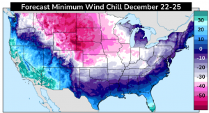 According to NOAA: “Temperatures 40 degrees below average and dangerous life-threatening wind chills as low as 50 degrees below zero are possible in the northern Rockies and northern Plains. Sub-zero to single-digit temperatures are likely across the central Plains, Midwest, Great Lakes, Ohio Valley and Midsouth.” In addition to the storm pushing eastward through the US, a separate system will bring heavy winter precipitation in the Pacific Northwest.