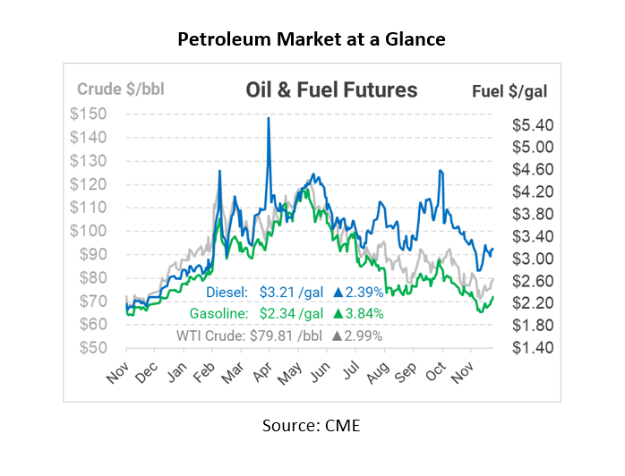 It’s been a relatively quiet week for fuel markets heading into the holidays, but that’s not stopped the market from drifting higher throughout the week. Economic data has shown continued strength in the US, with Q3 consumer spending up 2.3%. Jobless claims were also below market expectations. Fuel prices are up roughly 15 cents for the week, reacting both to the improved economic outlook and falling inventories reported in this week’s EIA report.