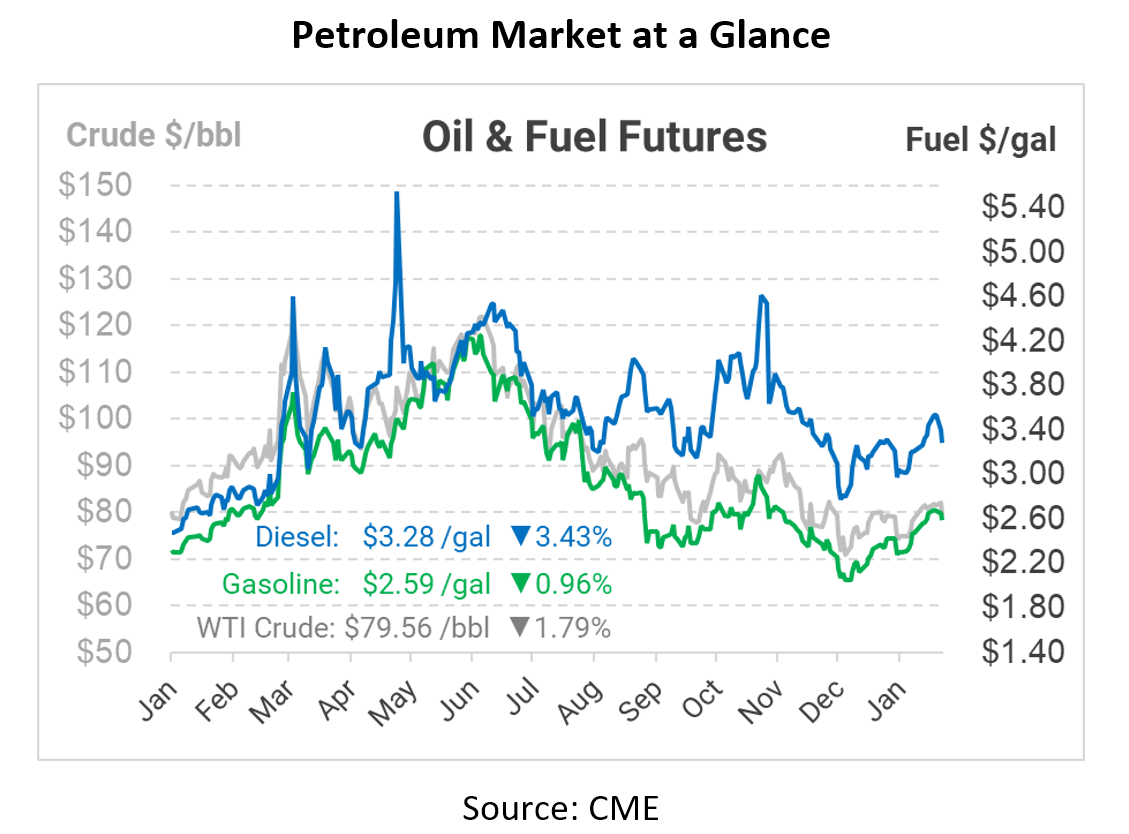 Like the rest of the market, diesel’s news this week has been broadly bullish. Refinery outages overseas mean less global supply availability, so the French strikes could have global implications. The EIA reported a small draw from diesel inventories, suggesting that supply is not keeping pace with demand. Yet prices are plummeting, perhaps a reaction to Europe’s move towards a $100/bbl price cap on Russian diesel. Although Europe will still ban Russian imports, the price cap would allow European companies to continue shipping and insuring deliveries to non-EU countries. It’s unclear who would buy that diesel, though – China is already an exporter of diesel fuel, so their strategy of absorbing cheap Russian crude may not apply for diesel. We’ll have to see what happens after the Feb 5 embargo hits.