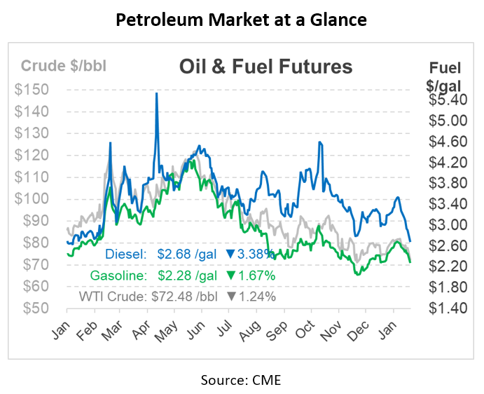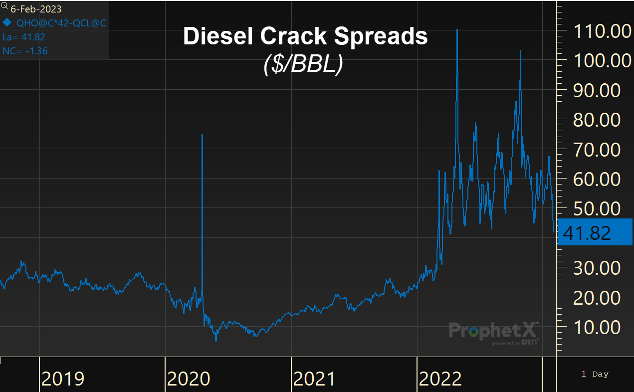 Yesterday, the implementation of the EU sanctions on Russian refined products took effect. The fuel market is actually trading lower, a sign that markets have already priced in any short-term supply disruptions. Europe has been importing significant diesel volumes, restocking to ensure they can get through the winter. Warm weather has helped prevent heavy demand spikes. With adequate inventory levels for now, expect diesel markets to be calmer in the short-term.