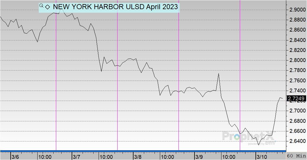 The April NYMEX ULSD contract has lost 24.5cts in value over the past four days. Diesel opened the week at its weekly high of $2.9099 and quickly began its descent. Today, diesel opened at $2.6664, a drop of 24 cents (-8.37%).
