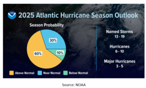 NOAA expects 13 to 19 named storms this year, with 6 to 10 becoming hurricanes and 3 to 5 reaching major hurricane status (Category 3 or higher). That’s significantly above the 30-year average of 14 named storms and 3 major hurricanes. There’s a 60% chance of an above-normal season and only a 10% chance of a quieter one.