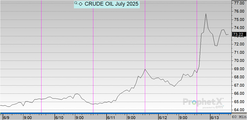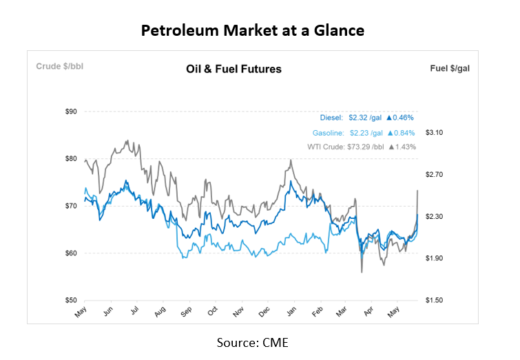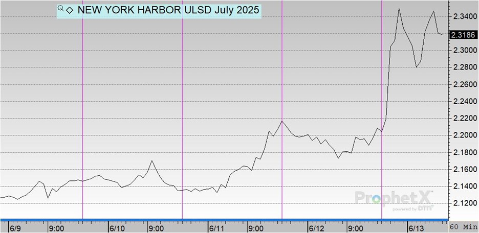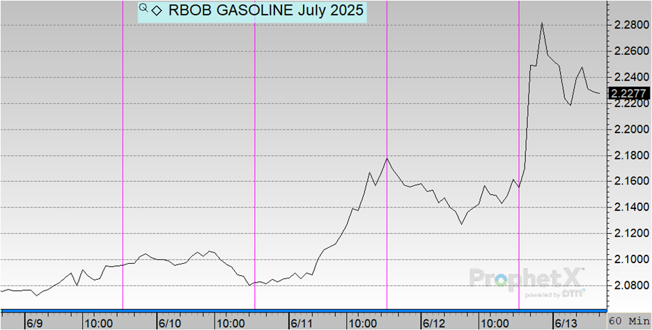 Fuel markets are heading into the weekend on a dramatic upswing following news that Israel has launched a military offensive against Iran, shortly after the expiration of a nuclear deal deadline. WTI crude prices jumped as high as $73 per barrel early Friday morning—up over $5/bbl from Thursday’s close. Meanwhile, ULSD futures have spiked by more than 13 cents, and RBOB gasoline is up by almost 9 cents.