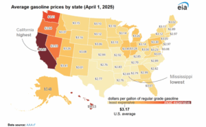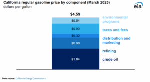 Taxes make up a significant portion of California’s gasoline prices. The EIA notes that, as of March 2025, drivers in the state paid around $0.90 per gallon in total taxes and fees. This figure includes:
