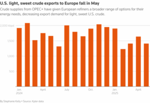 OPEC+ is increasing supply to regain market share from U.S. producers, which is putting downward pressure on crude prices, particularly for U.S. shale. As a result, major benchmarks like WTI-Midland and Light Louisiana Sweet have lost a portion of their premium value, while exports to Europe and Asia have declined. Refineries worldwide are shifting toward heavier and medium-sour crude grades, which are more cost-effective and better suited for fuel production — further weakening demand for U.S. light sweet crude. For U.S. producers, the impact could range from reduced drilling activity and output cuts to, if export losses persist, potential workforce reductions.