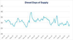 Looking ahead, refinery utilization is expected to remain in the low-to-mid 90% range. If exports, which have remained strong, begin to ease, refiners could make up ground in restocking inventories. The futures market is already responding to this imbalance, with diesel trading at a premium of 40 cents over gasoline — a clear signal that refiners should be maximizing distillate production. However, any disruption to refining output, such as from hurricanes or geopolitical instability, could quickly deepen supply tightness.
