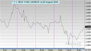 Diesel prices opened at $2.4569 on Monday and fluctuated throughout the week. Prices rose to a weekly high of $2.4965 on Tuesday before slipping to $2.4477 on Wednesday. Thursday saw a slight uptick to $2.4528, but prices fell again on Friday, closing the week at $2.4080. Overall, diesel declined by 4.89 cents, or 1.99%, from Monday’s opening level.