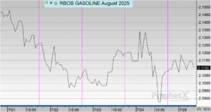 Gasoline prices opened at $2.1455 on Monday and trended downward through most of the week. Prices dipped to $2.1281 on Tuesday and continued to slide to $2.1042 on Wednesday. A slight increase was seen on Thursday at $2.1199 before slipping again to $2.1091 on Friday. Overall, gasoline fell 3.64 cents for the week, representing a 1.70% decrease from Monday’s opening level.