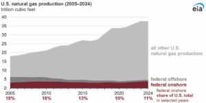 Natural gas output from onshore federal lands has also picked up. Production increased from 3.2 trillion cubic feet (Tcf) in 2020 to 4.2 Tcf in 2024. During the same period, total U.S. dry natural gas production grew from 33.8 Tcf to 37.8 Tcf, with the federal onshore share inching up from 9.6% to 11.0%. This shift marks a notable reversal from the long-standing decline in the federal government’s share of national gas output.
