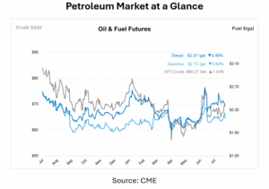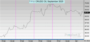 Crude prices opened the week at $65.15 on Monday and steadily climbed over the next several days. Tuesday saw a modest gain to $67.04, followed by a stronger uptick to $69.34 on Wednesday. Prices continued their upward momentum on Thursday, peaking at $70.30 before easing slightly to $69.35 on Friday. Overall, crude gained $4.20 for the week, a 6.45% increase from Monday’s open.