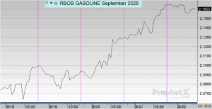 Gasoline prices opened at $2.0711 on Monday and moved steadily higher through the week. Prices climbed to $2.1015 on Tuesday before dipping slightly to $2.0905 on Wednesday. The upward trend resumed on Thursday at $2.1305, with prices reaching the weekly high of $2.1627 on Friday. Overall, gasoline gained $0.0916, or 4.4%, for the week.