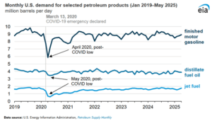 In April 2020, the first full month following the COVID-19 declaration, U.S. gasoline demand plummeted to 5.9 million barrels per day (b/d), which is the lowest since January 1974. By the following year, April 2025, U.S. gasoline demand had risen to 8.9 million b/d, 52% higher than in April 2020 but still below the April 2019 average of 9.4 million b/d. Gasoline demand gradually increased in the months following the emergency declaration.