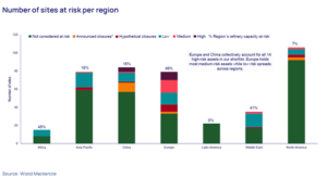 Middle East and Africa – Around 4.7 million b/d of capacity is at low or medium risk. In Africa, although all flagged sites are low-risk, they still represent nearly half of the continent’s refining capacity.