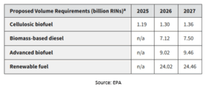 Previously, the RFS adjusted only fuel volumes. Now, the EPA is proposing a second control that ties RIN value to fuel origin, cutting RIN credit in half for biofuels and feedstocks sourced from outside the U.S. This change aims to strengthen energy security by reducing dependence on imports, which accounted for about 45% of biomass-based diesel in 2024. The EPA’s RFS volume requirements for 2026 and 2027 addresses exemptions for small refineries and consulting on how to handle reallocation volumes for past years.