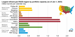 U.S. refining capacity is projected to decline by roughly 3% by the end of 2025, falling to about 17.9 million barrels per day. This reduction highlights the long-term trend of consolidation and closures across the refining sector. Today, the U.S. operates just 131 active refineries, down sharply from 254 in 1982, as smaller, less efficient plants have been shuttered in favor of larger, more complex facilities. While overall capacity remains robust, the gradual loss of refining infrastructure raises concerns about the industry’s ability to keep pace with shifting product demand, particularly during peak seasonal periods or unexpected disruptions.