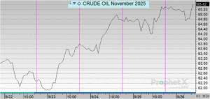 Crude prices opened the week at $62.74 on Monday and traded in a relatively steady upward trend. After a slight dip to $62.33 on Tuesday, prices increased midweek, climbing to $63.64 on Wednesday and $64.80 on Thursday. By Friday, crude opened at $65.20, marking the weekly high. Overall, crude rose $2.46, or 3.92%, from Monday’s open.
