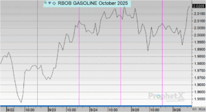 Gasoline prices opened at $1.9700 on Monday and edged slightly higher to $1.9799 on Tuesday. Midweek pressure pushed prices above the $2.00 mark, reaching $2.0072 on Wednesday and $2.0135 on Thursday. By Friday, gasoline eased marginally to $2.0070, but still closed the week higher. Overall, gasoline gained $0.0370, or 1.88%, from Monday’s open.