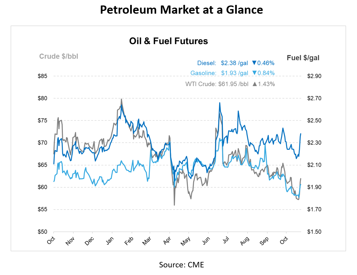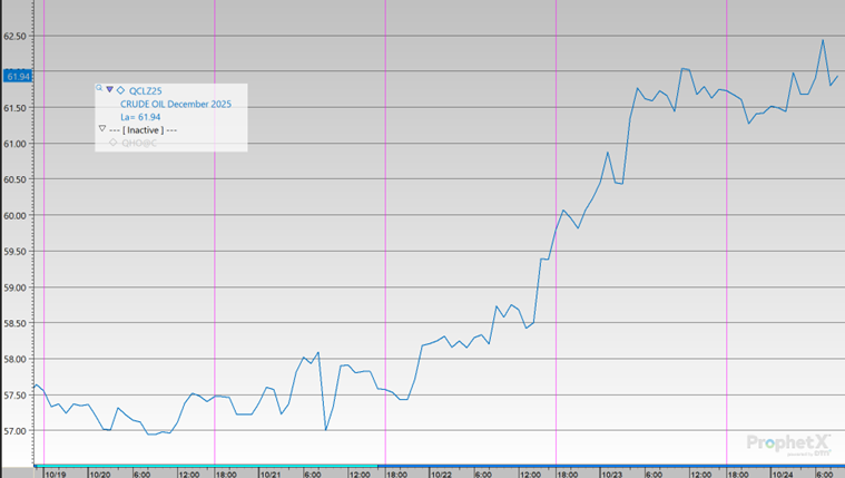 Crude prices climbed steadily throughout the week, with the largest gains occurring midweek. After a quiet start, edging up just $0.06 from Monday to Tuesday, prices surged by $1.73 on Wednesday and jumped another $2.93 on Thursday, marking the week’s biggest single-day increase. Crude opened slightly higher on Friday at $61.81. Overall, the market gained $4.87 for the week, a rise of 8.55%.