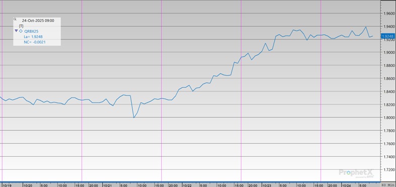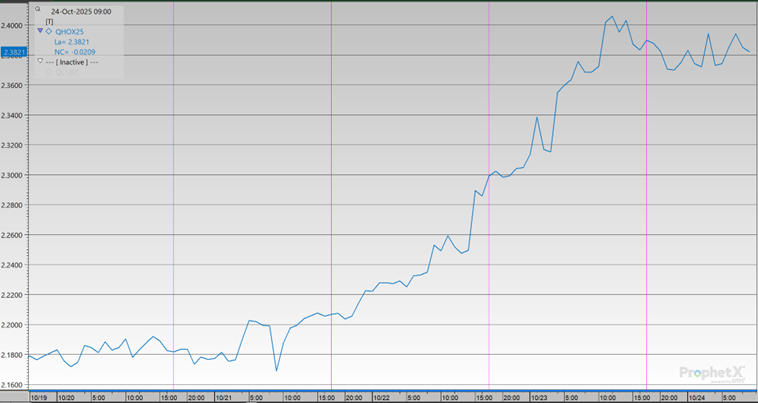Gasoline prices moved up overall this week, despite a small dip on Tuesday. After starting at $1.8234 on Monday and briefly slipping to $1.7991, prices surged midweek, climbing by $0.0651 on Wednesday and another $0.0700 on Thursday, the week’s biggest single-day gain. Prices held near that level into Friday, opening on Friday at $1.9247. In total, gasoline rose $0.1013, or 5.56%, from Monday to Friday.